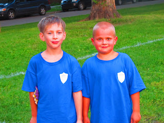 Monday nights throughout the summer the kids go to soccer. This is run by a man in our congregation who uses soccer as an evangelism tool. The kids all play soccer then there is a time for a message and prayer. The kids LOVE it. Here are some shots. These were taken the last day of soccer. Eric played with the bigger kids and Lindsay and Paul played with kids their own age. During a round robin play-off game, Eric and his team of six won gold. They were the smallest team yet definately played the hardest. They deserved those gold medals!!! Paul and Lindsay also won first. All I have to say is man, were those kids ever excited on the way home....try getting them in bed after that!